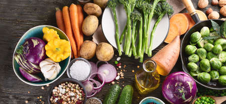 Fresh healthy food cooking or salad making ingredients on dark background with rustic wooden board. Diet or vegetarian food concept. Panoramic banner with copy space