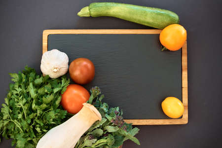 Vegetables dark background with copy space. Healthy meal. Menu, price background. Vegetables on black chalkboard.