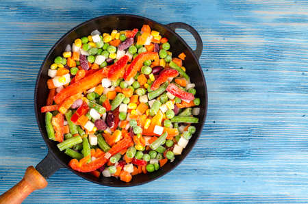 Frying pan with frozen vegetables on blue background. Studio Photo