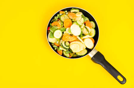 Frozen salad of vegetables in frying pan on black background. View from above. Copy space.