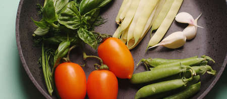 organic fresh vegetables courgette, tomato, asparagus, basil, dill, green peas, garlic in a frying pan