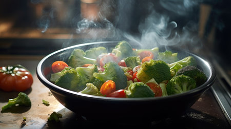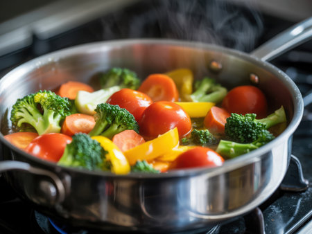 A colorful array of fresh vegetables sizzle in a frying pan, releasing steam and aroma in a rustic kitchen setting, perfect for healthy meal preparation.