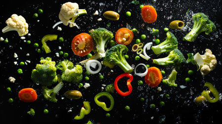 Vegetable soup. Pieces of fresh juicy vegetables are thrown into boiling water on a black background. Assorted vegetables are floating in the air. Vegetables include broccoli, carrots, peppers, olives, cauliflower and tomatoes. Vegan food