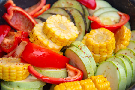 fresh chopped vegetables with spices for grilling, pieces of ripe corn, pepper, zucchini