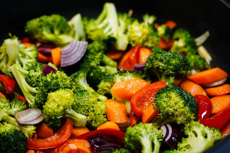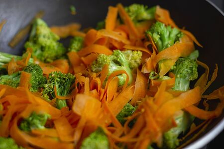 Macro photography of fried vegetables in the pan