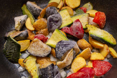 Frozen vegetables: zucchini, potatoes, red peppers, eggplant, covered with hoarfrost, in pan ready to fry. Close-up