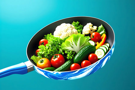 Frying pan and fresh vegetables with cooking