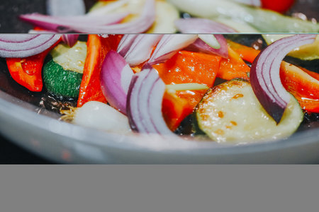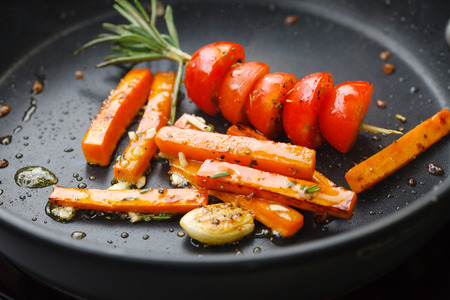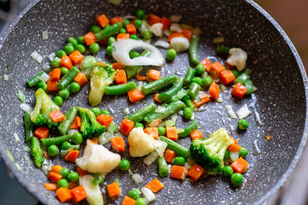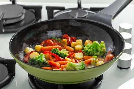 Fresh vegetables sizzling in a black frying pan. Organic bio food on a stove in the kitchen. Healthy nutritious cooking.