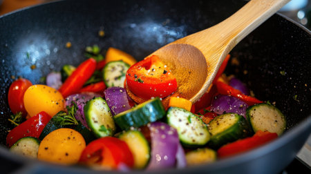 A vivid scene of fresh vegetables being stir-fried in a black pan on a stove. The array of colors creates an appealing and inviting atmosphere in the kitchen.