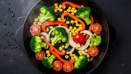 Fresh, colorful vegetables, including broccoli florets, sliced red bell peppers, onions, corn kernels, and halved cherry tomatoes, are being sauteed in a black frying pan. Steam rises from the hot pan, highlighting the cooking process of a healthy and delicious meal.