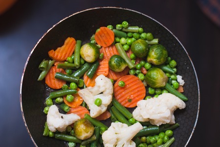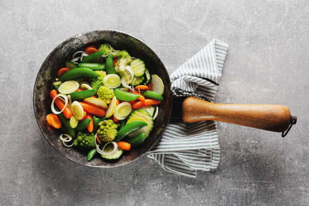 Mixed fresh vegetables in a frying pan, vegetarian food
