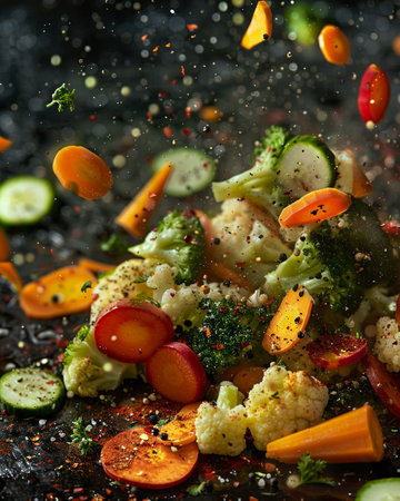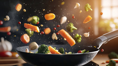 A frying pan in action with colorful vegetables like carrots, broccoli, and garlic flying into the air, creating a dynamic culinary scene.