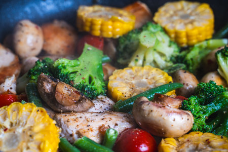 Background with vegetable texture. Corn, broccoli, mushrooms and green beans are fried in a pan. Close-up. The concept of healthy eating. High quality photo