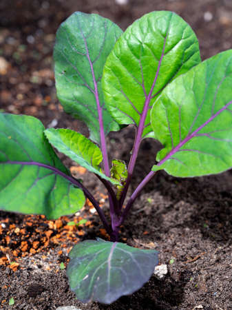 Young shoots of purple Brussels sprouts cabbage plant growing on organic farm close up