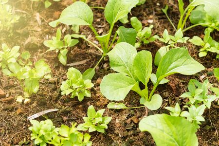 Lettuce and parsley leaves on vegetable bed on spring day. Growing fresh greens in garden. Eco products for sale in rural market