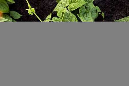 A young bean bush grows in a vegetable garden. Bean seedlings on the black earth. The theme of gardening, farming, a rich harvest, organic products. Horizontal photo.