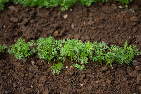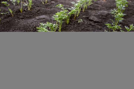 Beds of growing young carrots. Carrot seedlings on the farm. Carrot tops. Young carrot seedlings in the garden in spring. weak carrot seedlings have been torn out and are lying and drying on the ground. The theme of gardening, farming, a rich harvest, organic products. Horizontal photo.