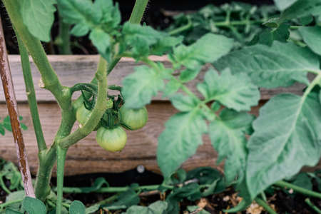 Small green tomatoes ripen in the greenhouse in summer. Growing vegetables, tomato plants.