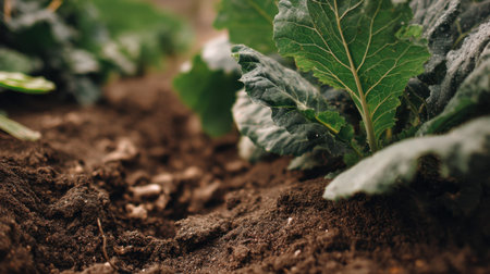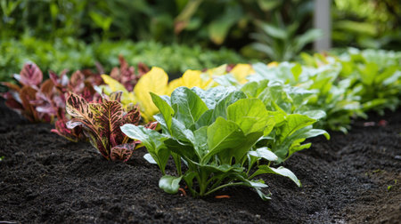 Lush green leafy vegetables thrive in rich garden soil, showcasing the beauty of nature and sustainable farming practices. This vibrant scene highlights healthy growth and freshness.