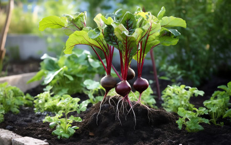 Generative AI : Growing table beet With green tops in the ground on light green natural background