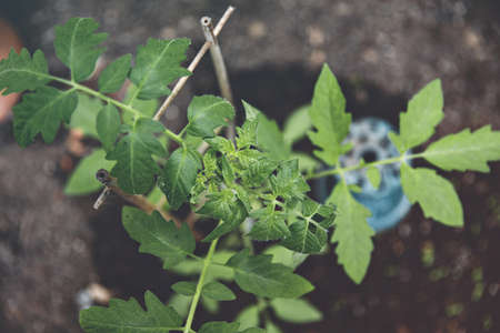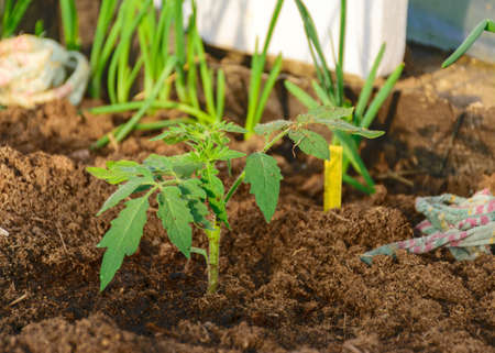 bush of tomatoes in the ground in a greenhouse. spring work with seedling in the garden.