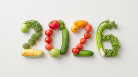 A vibrant display of assorted fresh vegetables carefully arranged to form the year 2026, representing a commitment to healthy living and sustainability.