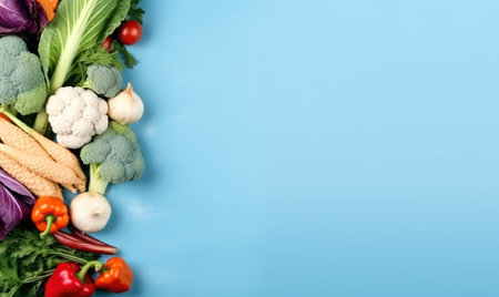 Top view vegetables on blue background. Cooking ingredient - carrot, tomatoes, cucumber, pepper, broccoli, onion. Vegetarian organic food banner. copyspace. Created with generative AI tools