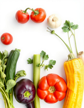 A vibrant assortment of fresh vegetables on a clean white background