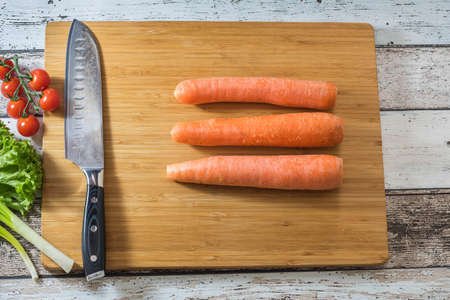 Santoku kitchen knife on a cutting board with fresh vegetables: carrots, tomatoes, lettuce and green onion on a wooden background top view