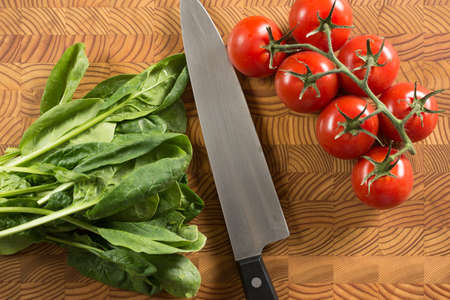 A bunch of spinach with a cluster of tomatoes on a wooden cutting board.