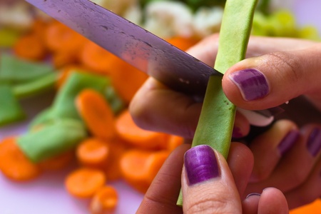 Woman Hand Cutting Carrot on a cutting board. Vegan Meal Preparation. Close Up