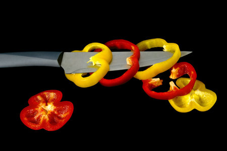 fresh vegetables on a light kitchen table. sliced paprika, orange carrot, two-tone paprika, red tomato and salad with knife on the kitchen table.