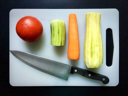 Tomato and pealed cucumber, carrot, zucchini and a kitchen knife, on white plastic cutting board and black table background