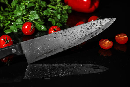 a small cut cherry tomato lies among other fruits and a knife. high quality photo