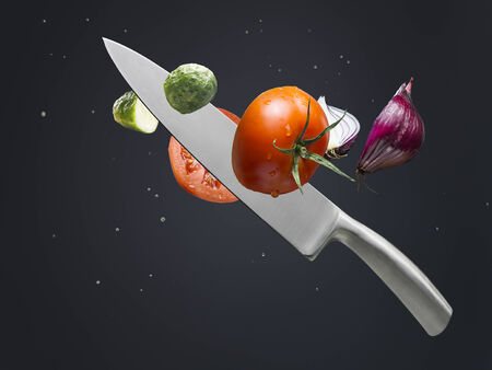 Vegetables, cutting board, diet, vegetarianism, tomato, fork, knife, cucumber.