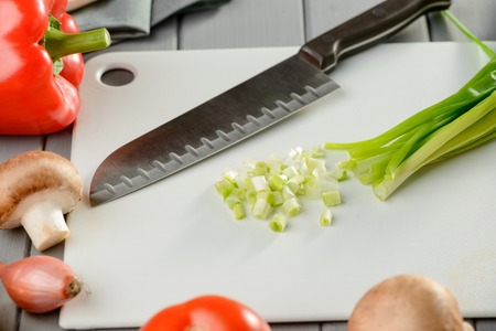 Chopped green onion on wooden Board, knife on white isolated background, healthy organic food concept.