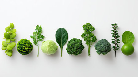 A stunning collection of fresh green vegetables and herbs displayed on a white background, perfect for promoting healthy eating and culinary creativity in food photography.