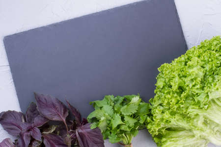 Background with assorted green vegetables. Purple basil, green parsley and lettuce with copy space. Healthy food and diet concept.