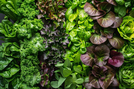 A closeup view of fresh green leafy vegetables, highlighting the vibrant textures and colors of spinach and other greens, perfect for promoting healthy eating choices.