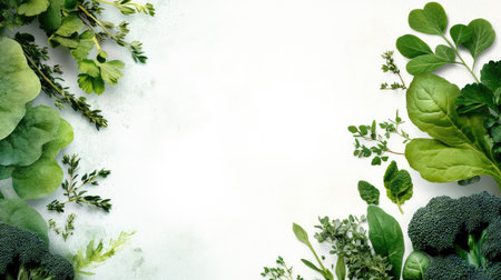 A vibrant arrangement of fresh herbs and leafy greens creates a beautiful border around a simple white background, perfect for culinary themes.