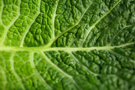 Close up savoy cabbage leaves. Patterned surface of green cabbage leaves.