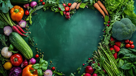 fresh fruits and vegetables arranged as frame and empty space for your text