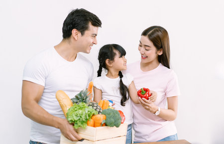 Portrait of smiling Asian family and happy little daughter coming home from grocery shopping with fresh vegetables in wooden box on the table. Responsible shopping, zero waste, sustainable lifestyle.