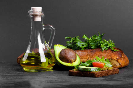 A colorful set of natural ingredients: a jar of olive oil, juicy avocado, salad leaves and a crusty bread on a stone table background. Healthy, appetizing avocado toast for a school lunch. Copy space.