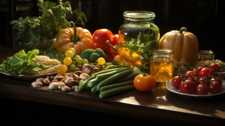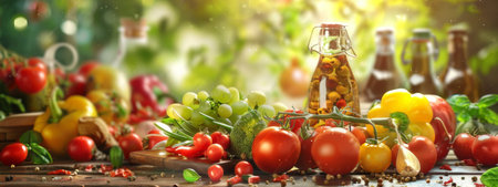 A rustic still life arrangement featuring bottles of olive oil, fresh vegetables, and grains on a wooden surface. The warm lighting and natural textures make it ideal for themes related to Mediterranean cuisine and organic food.