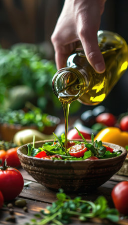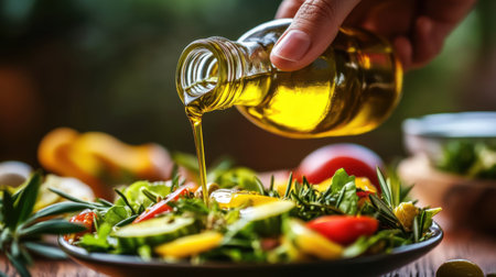Fresh Salad with Olive Oil Pouring for Healthy Culinary Inspiration and Cooking Design