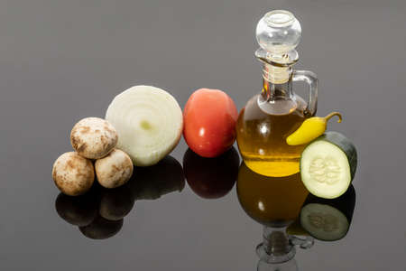 Vegetables mix with mushrooms, spices and fragrant not refined oil closeup. Products for cooking healthy and delicious food. Top view with copy space