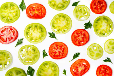 Creative layout made of tomato slices. Flat lay, top view. Vegetables isolated on white background. Food ingredient seamless pattern..