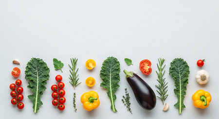Fresh vegetables on white background with copy space. Top view, flat lay