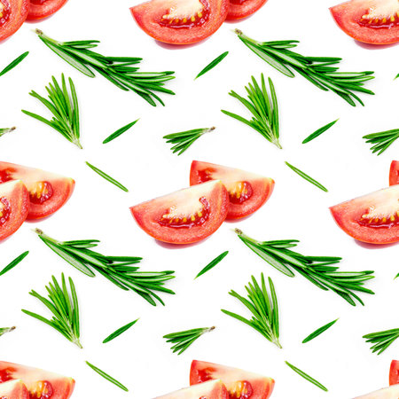 Red tomato slices and green rosemary repeat seamless pattern on white background.